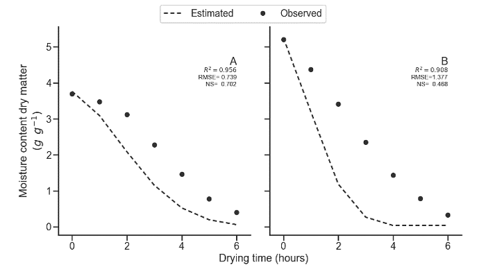 Note: *Mi is the moisture content (kg kg-1 dry matter) for each time i, M0 is the initial moisture content (kg kg-1 dry matter), t is the drying time (hours), α, β, γ and κ are empirical constants.