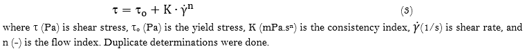 Apparent viscosity of TNM mixtures was measured by using a Physica MCR 301 rheometer (Anton Paar GmbH, Graz, Austria) equipped with a cylindrical geometry (inner diameter, 24.66 mm; outer diameter, 26.66 mm; height, 40 mm). After the thermal treatments, TNM mixtures were equilibrated at 20 °C for 5 min and a shear rate sweep from 0.01/s to 100/s was applied. The Herschel-Bulkley-Model was used to determine the rheological properties of enriched TNM according to Equation 3.