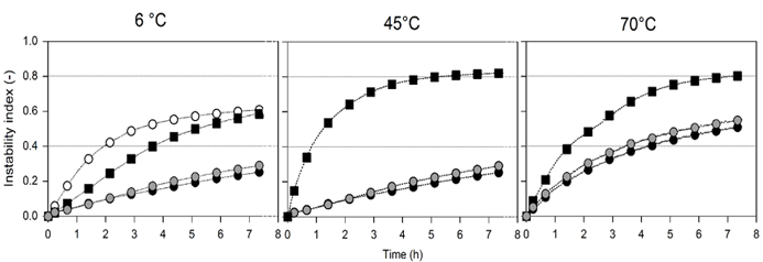 The impact of temperature on the stability of enriched TNM was monitored under accelerated gravitation and the instability index (I) of the dispersions, from I equals 0 (stable) to 1.0 (instable), was used as a measure of stability. In Figure 1, the instability index of plain TNM at 6 °C under centrifugation for 2 h was 0.41 ± 0.02. After enriching with proteins and hydrocolloids, 3CnX mixture showed the highest stability with I = 0.09 ± 0.01, followed by 1CnX (I = 0.14 ± 0.01) and 2CnG (I = 0.23 ± 0.03).