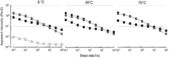 Plain tiger nut milk comprising 9.58 ± 0.12 g /100 g tiger nut solids at 6 °C revealed almost Newtonian behaviour with a viscosity of 3.00 ± 0.10 mPa.s at a shear rate of 1.0/s Figure 2.