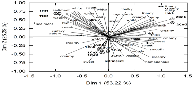 Figure-3. GPA group average plots for descriptors of tiger nut milk (9.58 ± 0.12 g/100 g, TNM) enriched with 1 g/100 g sodium caseinate and 0.2 g/100 g xanthan gum (1CnX), 2 g/100 g sodium caseinate and 0.2 g/100 g guar gum (2CnG) or 3 g/100 g sodium caseinate and 0.2 g/100 g xanthan gum (3CnX). Plots are based on duplicate experiments.