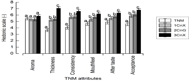 Figure 4 shows the impact of enriching TNM with proteins and hydrocolloids on the sensory appeal of TNM. One the one hand, the results depict that TNM enrichment did not affect consumers appeal for TNM aroma. On the other hand, 3CnX showed the highest consumer rating followed by a comparable rating for 1CnX and 2CnG in terms of thickness, consistency, mouthfeel, aftertaste and acceptance.