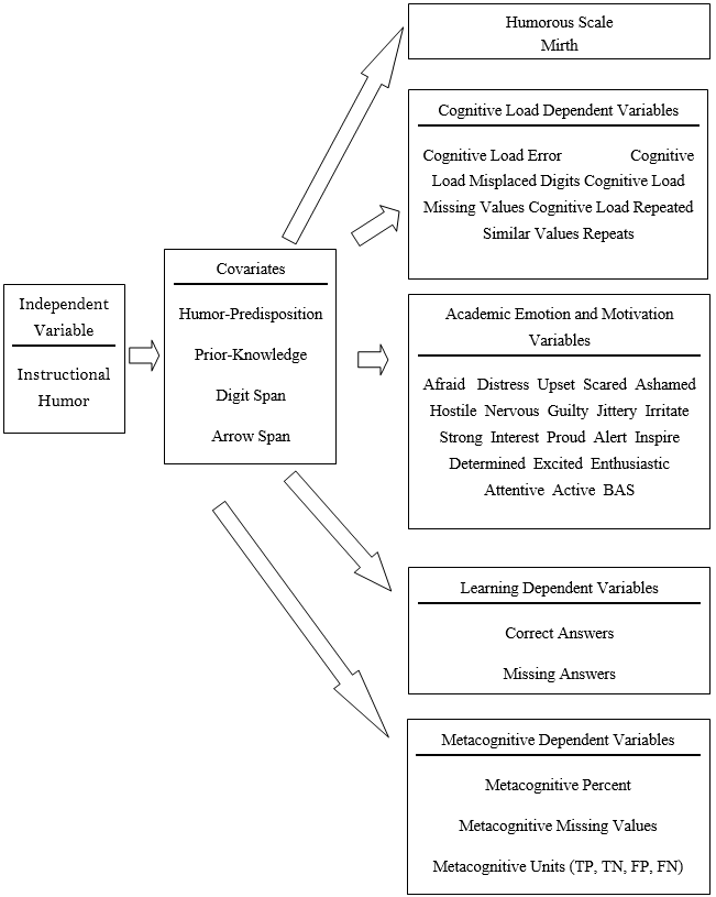 In the Cognitive Affective Theory of Learning with Media (CATLM) (Moreno & Mayer, 2007), findings have demonstrated that emotionally appealing shapes, color, and decorative pictures were not found to be types of the seductive detail effect (Park, Flowerday, & Brünken, 2015) but instead were new elements that fostered learning; classified as multimedia with emotional design (Heidig, Müller, & Reichelt, 2015; Mayer. & Estrella, 2014; Plass, Heidig, Hayward, Homer, & Um, 2014; Schneider, Nebel, & Rey, 2016; Schneider, Nebel, Beege, & Rey, 2018; Um, Plass, Hayward, & Homer, 2012). In a recent CATLM study (Dorambari, 2022) instructional humor (IH) was used as an IV and compared with the non-humorous (NH) condition. The study found that IH was also not a seductive detail, similar with the NH condition (thus did not harm learning) and as such could be used in education. The study offered a new educational approach in CATLM named instructional humor and cognitive affective learning with multimedia (IHCALM). However, the study did not offer any control to covariates, such as prior-knowledge, humor pre-disposition and working memory capacity (WMC). As such, the role of above-mentioned covariates on IHCALM was not known, which may place the application of IHCALM in education into question. Depending on the effects of covariates on IHCALM, it may turn out that this teaching approach would not reliably result in a non-seductive detail effect. It may also harm learning and thus should not be used in education, which might spare students from the joys of learning with humor in CATLM presentations. Thereby, the purpose of this study aimed to re-demonstrate that IHCALM was not seductive in two ways: direct replication and controlling the above-mentioned covariates. In this study, instructional humor (IH) was used as an IV and compared with the non-humorous (NH) condition. All other variables were identified as CVs and DVs in this study. Table 1 presents a list of all these mentioned variables, which is then followed by a theoretical framework in Figure 1.