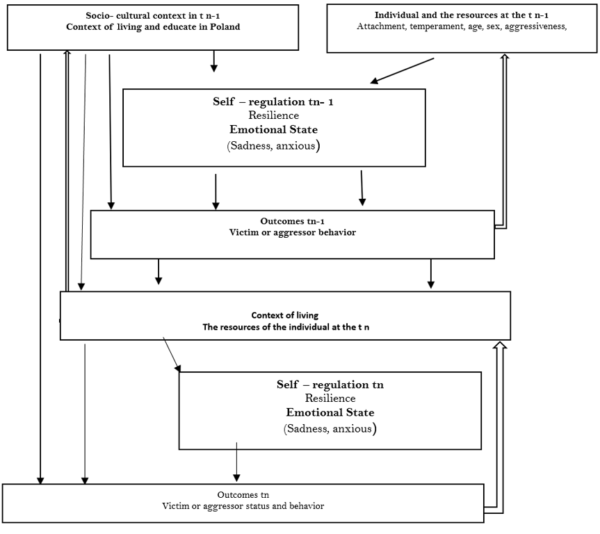 In the current study the following areas were examined: (1) adolescents’ intrapersonal variables (temperament, attachment, aggressiveness, resilience), (2) social support, (3) their current emotional state (sadness, anxiety) and gender. The study assumed that there were specific individual and social conditions that facilitated taking on the role of the aggressor or the victim (Krahé, 2013; Ostrov, Kamper, Hart, Godleski, & Blakely-McClure, 2014). In this paper, being an aggressor and being a victim are treated as parallel forms of social behavior in interpersonal relationships and that may be explained by the same processes (Osterman et al., 1994; Pratt, 2006). Assuming the aggressor and/or the victim behavior is treated as an output of the interaction of individual and sociocultural factors and as readiness for aggression or victimization revealed in interpersonal contacts.