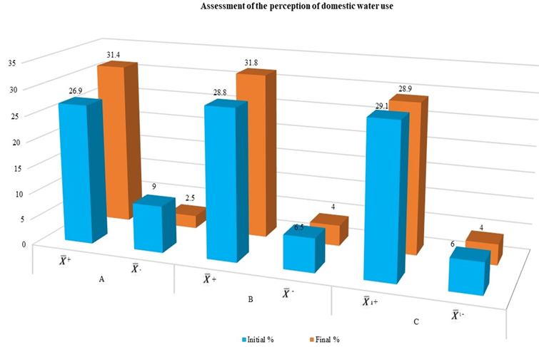 The intervention was completed only among groups A and B (Figure 4), starting with ‘The spider web’ that aims to integrate the group, countercriticism of the environmental problems in their community, including home and school, and probable causes and solutions. The approach was applied by implementing two didactic sequences involving undergraduate nurses throughout the semester in a different but complementary manner. Overall, two didactic sequences were developed in 16 curricular weeks (128 hours), lasting 2 hours per session. In the first didactic sequence, 20 sessions were developed: 46 hours with a facilitator and 20 independent hours (Table 2). In the second didactic sequence, 20 sessions were developed: 42 hours with a facilitator and 20 independent hours. Finally, the study conducted a descriptive (summative) evaluation of the level of knowledge, actions, perceptions, and practices on the prevention of water quality, conservation, and efficient use at home (Table 3).