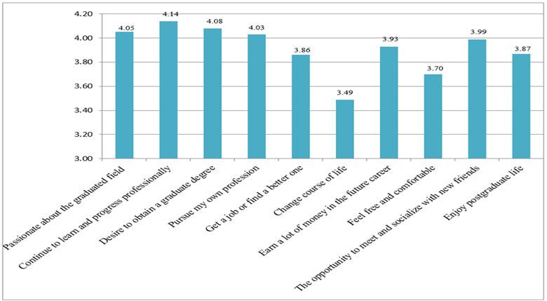 As shown in Figure 1, the sum of the weight value of each option showed that students chose postgraduate programs in HEIs (or university choice decisions) to enhance personal interest and their employment competitiveness which were based on the results from ten questionnaire items. The respondents graded various grounds for their university selection decisions, with the mean value ranging from 3.49 to 4.14, equivalent to a level of 4 (agree level) on a 5-point Likert scale. Figure 1 indicated that there was no significant difference in the motives of "passionate about the graduated field," "desire to obtain a graduate degree," and "pursue my own profession," with M (SD) of 4.05 (0.78), 4.08 (0.75), and 4.03 (0.72), respectively. Similarly, the mean for students' purpose "get a job or find a better one" was nearly identical, with M = 3.86, compared to M = 3.87 for "enjoy postgraduate life" and M = 3.99 for "the opportunity to meet and socialize with new friends." The explanation with the lowest rating is "change course of life," with M = 3.49 (SD =0.69), and the reason with the highest rating is "continue to learn and progress professionally," M = 4.14 (SD = 0.72).