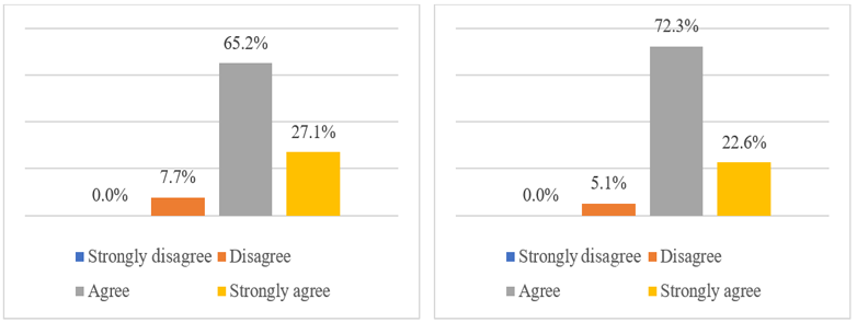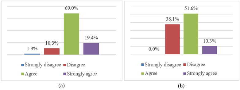 The students’ response to the availability of connection facilities to connect to the internet owned by the school s shown in Figure 3(b). There were 63.9% of students who responded "Agree" that there were internet facilities provided by the school that were expected to support the learning process, supported by 28.4% of students answered "Strongly Agree". However, 7.7% of students responded "Disagree" that the school provided internet connection facilities. According to the response of students who replied "Disagree", the internet network provided by the school did not reach their class.