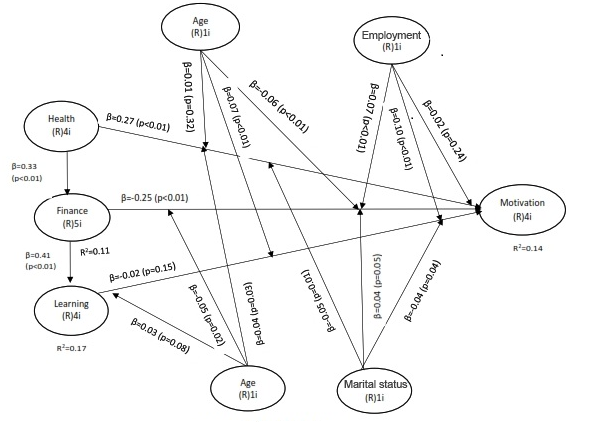 Figure 2 reveals that 14% (R²=0.14) of the total variation in motivation for programme completion was explained in the model by the independent variables (Health, Finance and Learning concerns). Also, 11% (R²=0.11) of the total variation in financial concerns was explained in the model by the independent variable (Health) and 17% (R²=0.17) of the total variation in learning concerns was explained in the model by the independent variable (Finance).  The R square (R²) values are low implying moderate models.