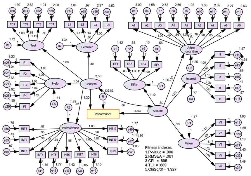 Figure 2 shows the standardized regression path coefficients between constructs. The coefficient of multiple determination of the model indicates that about 25% of the students' performance in statistics concept examination was explained by their attitude (affect, interest, value and effort) and concern (interpretation, test, help and lecturer) level towards statistics, while the other 75% was influenced by others.