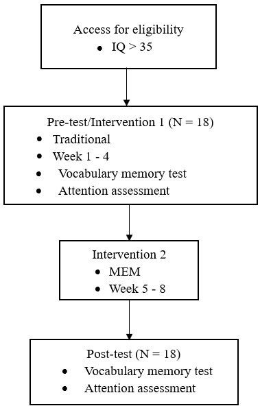 In this study, because of the small number of participants, it was not possible to randomize groups or set up parallel control groups due to practical conditions. Therefore, quasi-experimental research was used, which means that no separate control group was set up, but the experimental group itself was used as a control group to compare the situation before and after the intervention. The experiment lasted for eight weeks, with one 30-minute class per week. During weeks 1 to 4 of the experiment, 18 DS children participated in traditional classes, where all Chinese vocabularies were taught only through speech. The teacher taught the children to memorize six Chinese vocabularies through repetition each time. Meanwhile, the participants' attentional responses were observed and scored by the expert and the researcher during the class. After 30 minutes, a test was administered. At weeks 5 to 8, these participants were invited to participate in MEM classes. The same six vocabularies were selected; during this time, however, the MEM program was used to teach them. In the MEM class, the teacher composed songs using familiar musical melodies (such as "Twinkle Twinkle Little Star") for all Chinese vocabulary and taught them with Orff instruments and bodily movement. Similarly, in the MEM classes, the expert and the researcher observed and scored the participants' attentional responses.