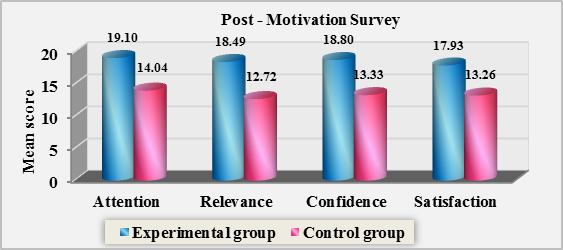 This study also found statistically significant difference in motivation between the experimental and control group in learning as shown in post-Motivation Survey scores. Motivation is especially important as it the driving force behind learning. Motivation is currently an under-researched topic in virtual learning environments. Understanding motivation could be tremendously important in the field of education, as it could offer a predictive as well as prescriptive view of behavioral change.