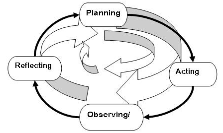 Lewin (1946) asserts that action research is something that is very important for social practice such the field of education and nursing. Even though action research is not scientific in itself, it does bring into it an element of experimentation with that intervention or action that has been developed. His original idea was that the cycle should start with a process of reconnaissance to identify the key features that form the activities of the group being studied. According to him, the process is never a simple process but one that involves successive actions such as planning, acting, observing and reflecting (Fig 1) in a cycle of testing and improvement. He believes that the action within the cycle should arise from a process of exploration of social interactions rather than only from rational deduction.