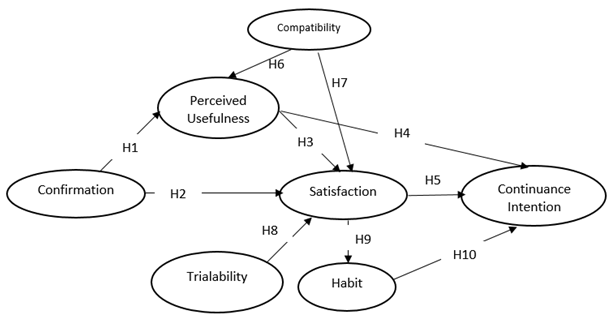 Note: Perceived Usefulness (PU); Compatibility (COM); Triability (TRA); Satisfaction (SAT); Confirmation (CF); Habit (HAB); Continuance Intention (CI).