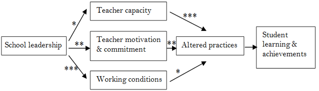 Figure-1. School leadership benefits teachers' practices and students' learning outcomes (Leithwood et al., 2008) * = weak impact; ** = moderate impact; ***=strong impact.