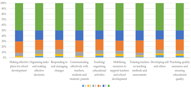 The ability of school leaders in supporting teachers and developing teachers’ teaching capacity were ranked high in both self-reporting and teacher data (see Figure 4). School principals all agreed on the crucial role of teachers in the quality of education and students’ learning outcomes, and therefore had paid special attention to supporting, training, and monitoring teachers. Professional development activities, including training new teachers and retraining existing teachers on teaching pedagogies and subject matter knowledge were reported to be regularly organised. Teachers were assigned to their subject units where they had weekly and monthly meetings to exchange knowledge and experience, and to discuss weekly and monthly teaching plans. Subject heads then reported these to school principals who then advised on further actions. School principals believed that they were very supportive of teachers’ professional development plans, such as pursuing a higher degree or attending external training courses or workshops, and they created all possible favourable conditions for teachers such as reducing teaching workload and arranging flexible teaching options.