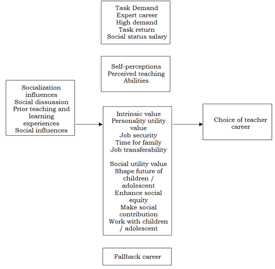 Looking at Figure 1, on the left are the antecedent socialization influences which are social discussion, prior teaching and learning experiences and social influences. These variables influence task, self, values and career perceptions. Task perception consists of task demand and task return. Self-perception deals with individuals perceived teaching abilities. However, the perception of task values consists of intrinsic career value, personal utility and social utility value with their various components as shown in the diagram. On the right is the outcome which is the choice of a teaching career (Suryani et al., 2013).