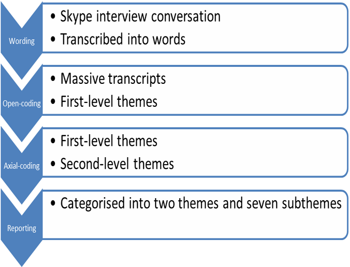 The researcher employed the open-coding technique to narrow the large-size and uncategorised materials into the first-level themes. Scholar (Thomas, 2006) believed that first-level themes should be categorised into narrowed and concentrated themes for reporting. Therefore, the axial-coding technique was used to reduce the themes and information into further second-level themes. As a result, two themes and seven subthemes were categorised. Figure 1 indicated the data analysis procedure.