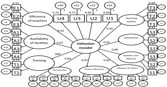 The second hypothesis (The efficiency of the e-learning system (Moodle) affects the use of faculty members). The results show that the efficiency factor of the e-learning system is one of the factors affecting the use of faculty members for the e-learning system as the results of the pathway analysis of the worker is (β = 0.87; p <0.01), which is considered statistically significant. Salim (2013) confirmed that the effectiveness of the integrated education in Al-Balqa Electronic Academy from the viewpoint of members of the teaching profession at Al-Balqa Applied University. This was of varying degrees between medium and high, and the researchers confirm that the efficiency of the e-learning system represented by ease of use and contains all applications that serve the educational process factors that affect the use of faculty members.