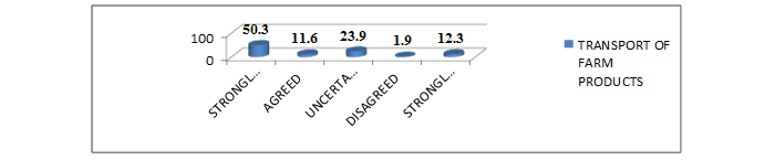 The survey reveals that 50.3% of the respondents strongly agree that bad road has negative effect on farm product transportation, 11.6% agreed, 23.9% were uncertain, 1.9% disagreed, while 12.3% strongly disagreed to that effect. This indicates that bad road can lead to product damage during transit, decreased on-time pick-up and delivery of product, high product price etc.