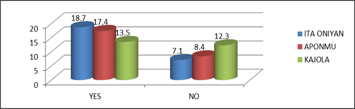 The Figure 2 below shows the total percentage of respondents - farmers, traders or drivers, who make trips to urban market for the purpose of distribution of farm produce. This analysis was carried out due to the fact that it is only those who travel to urban markets for product distribution purposes that could answer the question on the effect of the state of the road on agricultural product distribution. From the survey 18.17% of the respondents in Ita-oniyan village make trips to urban market while 7.1% do not, making a total of 25.27% of the total respondents in all the villages. 17.4% of the respondents in Aponmu village make trips to urban market while 8.4% do not, making a total of 25.8 of the total respondents in all the villages.13.5% of the respondents in Kajola village make trips to urban market while 12.3% do not, making a total of 25.8% of the total respondents in all the villages.