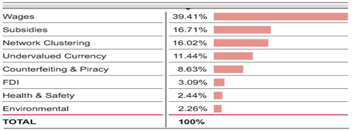 According to the study of Pitter Navarra about China’s price economy, 8 main factors can lead to reduction of final price of Chinese products and their competitiveness in global market. The factors include low payments of workforce (39%) foreign direct investment as a catalyst (3.09%) exportable subsides, which would be paid mainly in form of production subsides (16.71%) cluster production of industrial network (16%) low value of national currency (11.44%) industrial espionage (9%) safety and health of staff (2.44%) and regulations for neglecting natural environment (2.25%) (Peter, 2006).