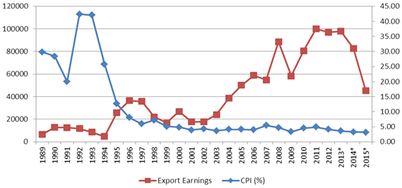 Figure 1 depicts the relationship between Nigeria’s total export earnings and global CPI from 1989 to 2015. The figure clearly shows that there has been a reverse in the direction between the two variables. However, the past decade till date was characterized by relative stability in CPI. The impact has been a steady rise in total export earnings, given that the relatively stable global CPI has a moderate positive effect on Nigeria’s trading partners, thereby resulting in higher demands for Nigeria’s export. The sharp decline experienced between 2008 and 2009 was due to the global economic crisis, indicating the likely impact of uncertainty on the Nigerian economy. However, export earnings rose slightly around 2010-2011 and started declining most probably due to the fall in crude oil price which contributes almost 90 per cent of Nigeria’s export earnings.