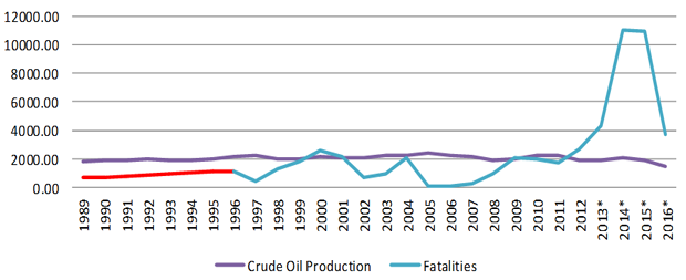 Figure-4. Conflict Intensity and Crude Oil Production in Nigeria