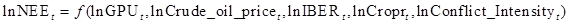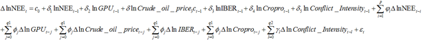 lnNEE is the natural logarithm of Nigeria’s export earnings dominated in United States Dollars; lnGPU is the natural logarithm of global economic policy uncertainty computed by Baker et al. (2012;2015;2016) which is considered a robust measure of global uncertainty since it captures at least, seventeen (17) biggest economies in the globe; lnCrude_oil_price reflects the global crude oil price (the introduction of this variable in the model is based on the known fact that Nigeria’s export earnings is predominately from crude oil receipt and oil price volatility affect export earnings); lnIBER is interbank exchange rate (which is introduced to capture the effect of Naira to dollar fluctuations on Nigeria’s export earnings); lnCropro represents crude oil production in Nigeria (which is also a major determinant of Nigeria’s export earnings); and lnConflict_Intensity is a proxy for fatalities from armed conflicts in Nigeria (see Ezeoha and Ugwu (2015)). Conflict intensity is defined in line with Arm Conflict Location and Event Data Project (2016) as “political violence on civil and communal conflicts, violence against civilians, militia interactions, rioting and protesting”. Conflict intensity is an endogenous shock that could disrupt productive activities and adversely affect export earnings from non-oil economic activities such as cash crops.