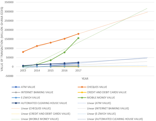 Responses from the respondents were collected for analysis. The Statistical Package for the Social Science (SPSS) was used in the analysis of the data. All data collected, both primary and secondary, were analysed quantitatively. Trend analysis and projection was used to analyse the secondary data on the values of cashless system transactions made between 2013 and 2017. The results from the primary data were analysed and presented in tables using descriptive statistics like mean and standard deviation.