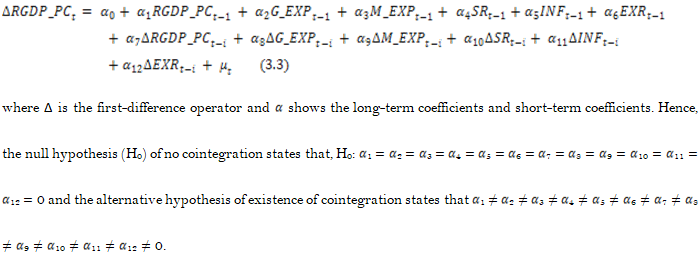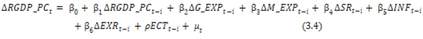 Where the difference operator is denoted by Δ; the Error Correction Term (ECT) is derived from the short-term co-integrating relationship specified in the ARDL model in Equation 3.4. In Equation 3.4, 𝜌 should be negative, less than one and significant.