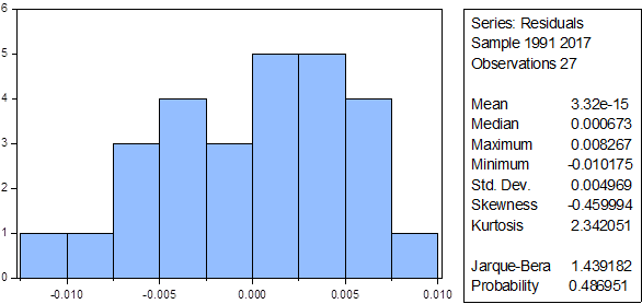 Table 4.1 shows the descriptive statistics of RGDP_PC, G_EXP, M_EXP, SR, INF and EXR. It shows that all the variables under consideration contained 30 observations. RGDP_PC had the highest mean value followed by G_EXP, M_EXP, EXR, INF and SR, respectively. The table also shows that, INF was mesokurtic as its value was greater than three while RGDP_PC, G_EXP, M_EXP, SR and EXR were platykurtic as their values were less than three. The probability of the Jarque-Bera showed that all the variables, except INF, were normally distributed.