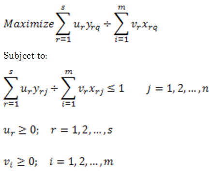 where: ur is optimized weight of rth output (r=1,2,...,s), vi is optimized weight of ith input (i=1,2,...,m), yrq is produced amounts of rth output (r=1,2,...,s) for DMUq, xiq is consumed amounts of ith input (i=1,2,...,m) for DMUq, yrj is produced amounts of rth output (r=1,2,...,s) for DMUj (j=1, 2,...,n), xij is consumed amounts of ith input (i = 1,2,...,m) for DMUj (j=1, 2,...,n).