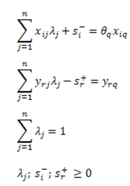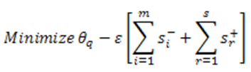 Where: θq is efficiency of DMUq, ε is non-Archimedean constant (10–6 or 10–8 ), sr+ and si– are input or output slacks, λj is weight assigned to the DMUj (j=1,2,…,n).