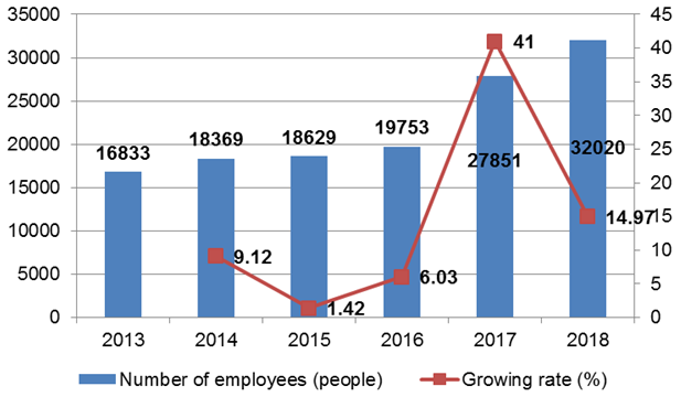 From 2013 to 2018, Vietnamese Government has formulated and completed the supporting policies for SME development in general and human resource development for small and medium-sized service enterprises in particular. The human resource training and development plan for SMEs is integrated into the five-year, five-year socio-economic development plans of the ministries and localities. Resolution No. 35 / NQ-CP dated May 16, 2016 on supporting business development up to 2020, affirming that enterprises are the service subjects, creating all favorable conditions for people and businesses to start businesses, business freedom in industries that are not prohibited by law. Strong support and flexible mechanism in creating an open, transparent, attractive and favorable investment environment for investment attraction and business development, improvement of administrative procedures and construction infrastructure, ... of Thai Nguyen Provincial People's Committee (2017) has facilitated many domestic and foreign enterprises to establish, thereby contributing to creating jobs for many human resources of Thai Nguyen province as well as other provinces in the region. According to Figure 1, in the period of 2013 - 2018, the number of employees working in the service enterprises increased rapidly, especially in 2017 with a growth rate of 41%. In 2013, the number of employees working in the service enterprise was 16,833 people; the number of employees increased to 32,020 people in 2018.