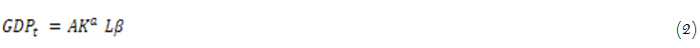 In this equation, GDPt represents the measure of economic growth over time thus GDP per capita at time, K represents capital stock which encompasses the human and physical capital investment and L represents labour. However, in Equation 1 and 2 the production functions are endogenous because the residual component A is endogenous as it measures technological advancement and progress. Moreover, α and β connotes the elasticity of output of labour and capital in retrospective. In the study’s empirical composition, the endogenous growth model considers role of information technological advancement such as secure internet servers, fixed broadband subscriptions and internet usage, investment in physical and human capital thus gross capital formation and school enrolment rate and other policies such as trade openness as these can be critical and crucial ingredients for social media usage and economic growth. The basic assumption or intuition is that social media usage can be efficient when there is consistent and constant supply of internet services with reliable technological support. Also, among other things, the able functioning of social media platforms rely or depend on the openness of the economy and total factor productivity. Therefore A can be found as: