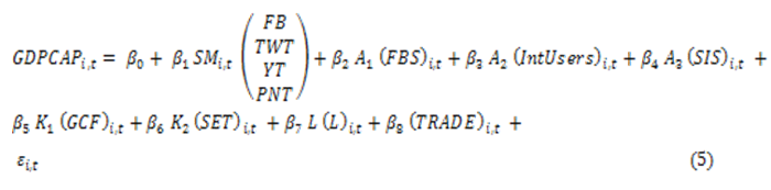 GDPCAP = f (SM, FBS, IntUsers, SIS, GCF, SET, L, TRADE) (4)