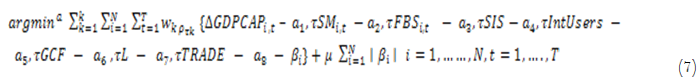 represents GDP per capita in country i at time t and K is the index of quantiles. Wk is equal to 1/K which stands for the relative weight on k-th quantile, and at the same time used to explain the implications of various quantiles in the estimation (Cheng et al., 2019; Koenker, 2004; Zhu, Duan, Guo, & Yu, 2016). Furthermore, μ is equal to 1 and represents the tuning parameter (Cheng et al., 2019; Lamarche, 2011; Zhu et al., 2016). The description of the variables in equation can be found beneath Equation 6.