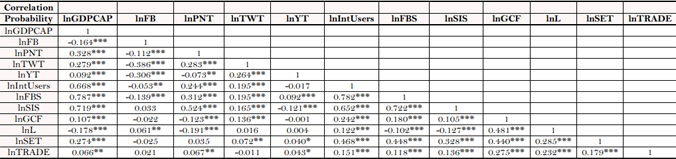 In Equation 3 all other things being equal, it is assumed that the efficiency of social media (SM) in which all factor inputs are utilized rely on internet users (IntUsers), fixed broadband subscription (FBS), secure internet servers (SIS) and openness (TRADE) of an economy.