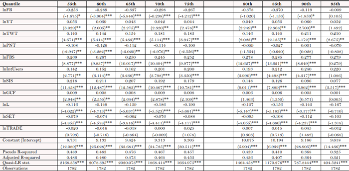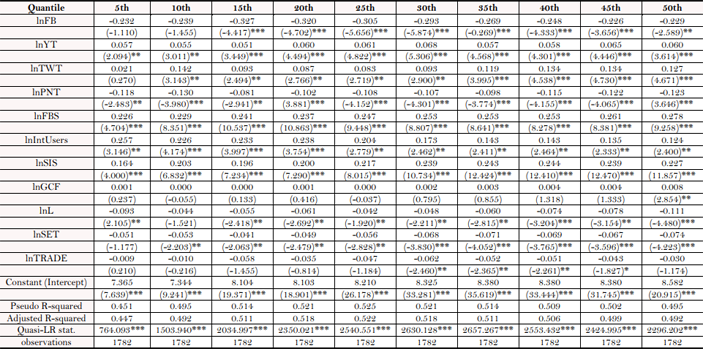 Subsequently, the study further utilizes panel quantile methodology to understand how social media usage or penetration impacts or functions in the upper and lower quantiles of economic growth as in lower and upper gross domestic product per capita countries. By application of this method, the driven factors of social media (Facebook, Twitter, YouTube and Pinterest) on economic growth can be examined in different quantile levels for robust estimations. In so doing, the study considers the model proposed by Koenker and Bassett (1978) for panel quantile regression and adopted from Cheng, Ren, and Wang (2019):