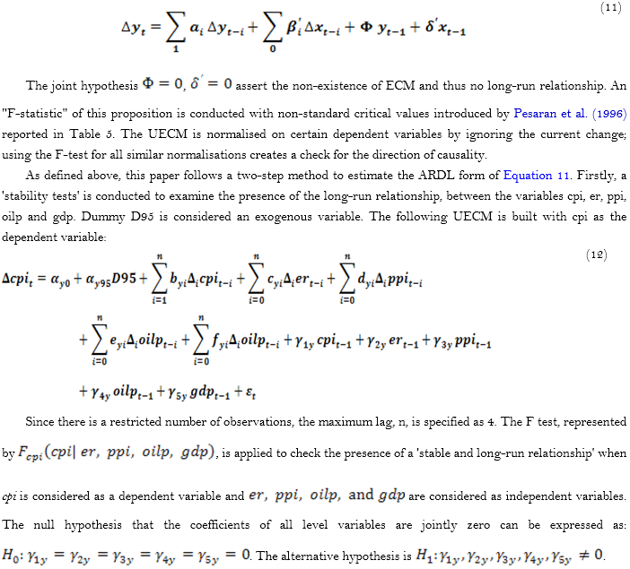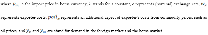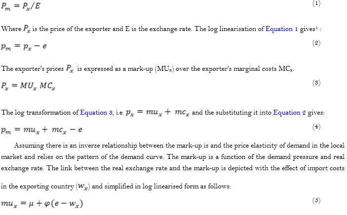 Following Campa and Goldberg (2005) model on ERPT, this paper adopts a micro-based partial equilibrium mark-up model which incorporates some general equilibrium aspects at aggregate price levels. We extend the model by including the impact of domestic costs of the importing country. The import price Pm of a nation can be presented asφ lies between 0 and 1. If φ = 0 it implies producer currency pricing (PCP), meaning change in exchange rate does not affect the price. Whereas if φ = 1, it implies local currency pricing (LCP) meaning the change in the exchange rate is fully transferred to the price with on effect on the mark-up assuming the marginal costs are fixed. The μ in Equation 5 stands for constant. To make it simpler, Equation 5 eliminates the effect of other factors, like demand pressure in the local economy. The Equation 6 is a log linearised form: assuming the exporter’s marginal costs increases by a weighted average of market wage wx; with other prices such as oil prices, poilx, and the demand pressure in the exporting country, yx, and the demand pressure in the local market, ym.