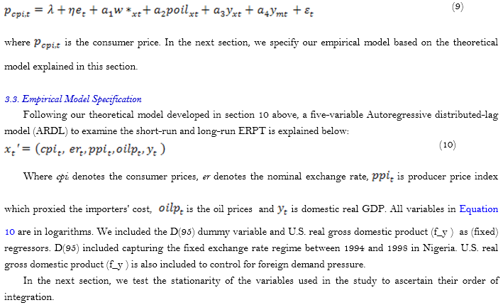 Section 2 of the paper reviews the literature, which includes ERPT studies on Nigeria and the channels of ERPT. The third section explains the theoretical ERPT model and the model used in the empirical analyses. Whereas, Section 4 is the empirical analyses of the observed results. Whereas Section 5 concludes the paper and provides policy recommendations.
