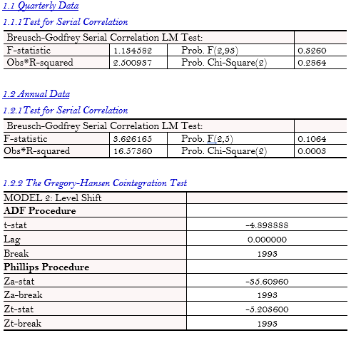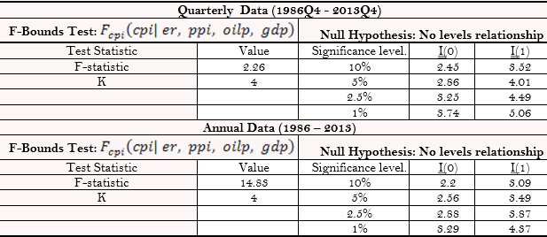 Table 2, shows that all variables with both quarterly and annual data are stationary at levels, except lppi, which non-stationary with the annual data. Given that not all variables are I(0), we examine the causal relationships in long-run and short-run between consumer price and exchange rate and the other variables applying the Bounds testing procedure.