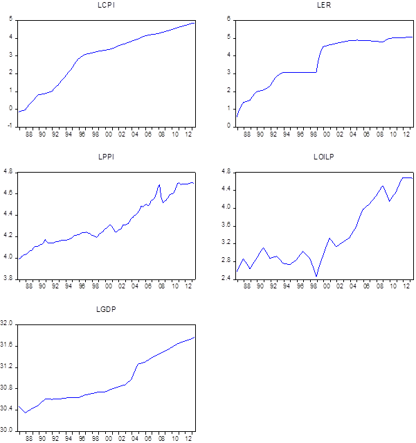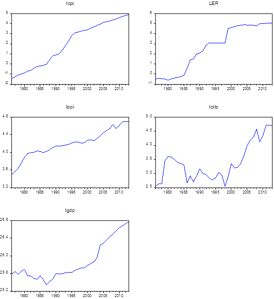 lcpi, ler, ly, loilp and lppi are logarithms of cpi, er, y, oillp and ppi respectively.
