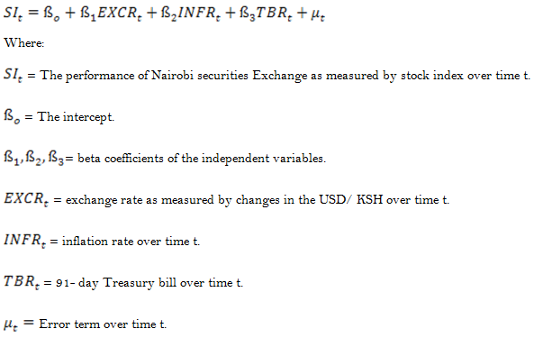 The study targeted all companies listed on the Nairobi Securities Exchange during the period of the study. Time series data used in the empirical analysis is mainly secondary data collected from Central bank of Kenya and Nairobi Securities exchange. Daily data spanning from January 2020 to May 2020 was used to understand the effect of exchange rate fluctuations and the performance of Nairobi Securities exchange during the coronavirus pandemic in Kenya. Daily data was used so as apprehend better the underlying forces of currency and security market interrelationships. The performance of Nairobi Securities exchange was measured by the stock index while exchange rate fluctuations were measured by the changes in Kenya shilling to the US dollar. Inflation rate and interest rates are the intervening variables that affect both the dependent and independent variables. A multiple regression analysis estimation model was employed to analyse data with the help of SPSS statistical software. The following model was used: