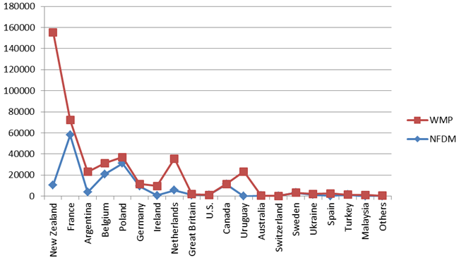 We deduce from the previous Figure 2 and table In CY 2017, Algeria imported whole milk powder from New Zealand (54.813 percent) followed by the Netherlands (11.34 percent), Uruguay (8.85 percent) and Argentina (7.26 percent).