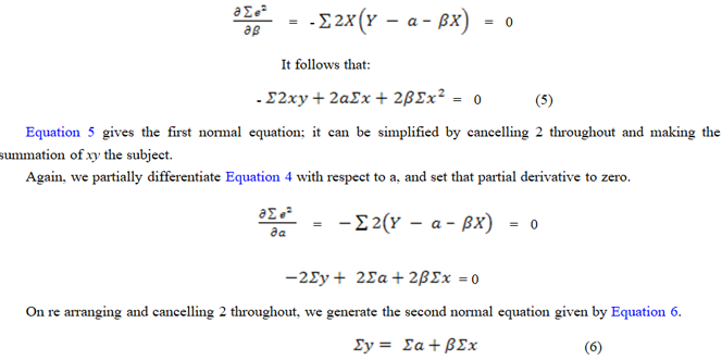The aim of the Least square method is to choose the values of a, and β which minimize the sum of squared error terms e. Equation 2 can alternatively be expressed as: