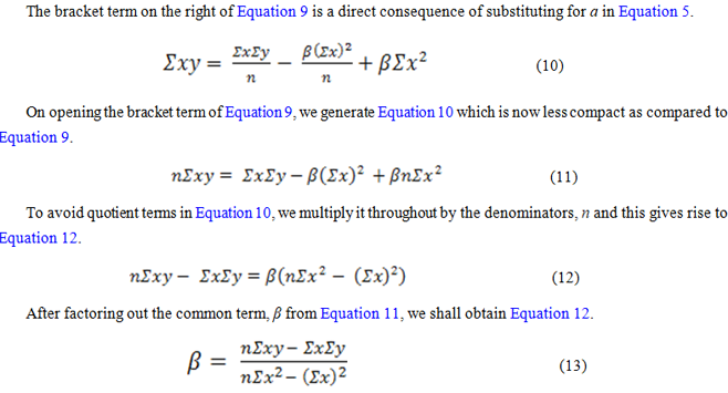 From Equation 12, the slope parameter, β can therefore be expressed as a function of x, y and n as given by Equation 13.