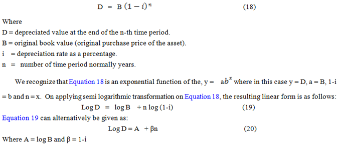 Equation 20 is now a simple linear regression of log depreciated value on independent variable n, the number of time period. The intercept A is the logged book value of the assets and the slope parameter β, captures the information about the depreciation rate.