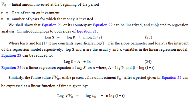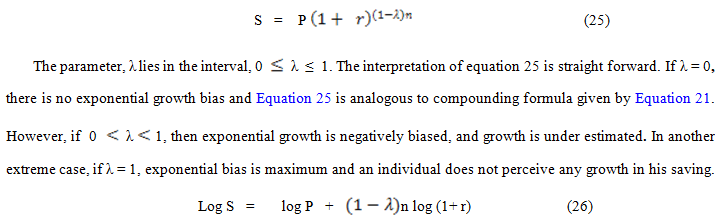 The linear transformation of Equation 25 yields Equation 26. From Equation 26, when we take log(1 + r) to be the slope parameter of the regression equation and time n as independent variable, it is easy to see that as the size of λ increases, the term, log (1+ r) will be understated and subsequently the sum, S arising in future after nth period will be understated thus leading to future value bias.