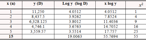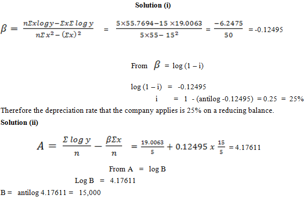 Table 2 generates key values that are necessary for regression model based on information given in Table 1. The variable Y has already been transformed to the logged variable but the basic principles of application of regression model will be followed. Specifically, Table 2 will help us to determine the slope of regression model and the intercept. The resulting regression equation will provide important insights to the above problems of accounting for depreciation using reducing balance.